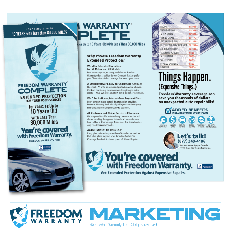 This colorful trifold brochure opens to a full 8.5 x 11-inches that describes the essential features of the Freedom Warranty COMPLETE Extended Protection Plan for vehicles up to 10 years old and with less than 80,000 miles. Fits in a standard brochure rack. 50/brochures per package.